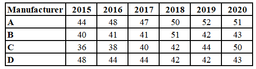 The following table shows the sales of cars of four manufacturers for the period from 2015 to 2020 in a metropolitan city (all the figures are in thousands).