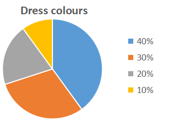 The following pie chart shows the different coloured dresses worn by 60 students in a college party. Study the pie chart and answer the question that follows.