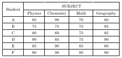 The following table shows the marks (in percentages) obtained by six students in four different subjects in an examination. The maximum marks in each subject is 100.