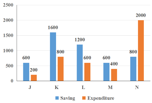 The bar graph given below shows the saving and expenditure of 5 companies J, K, L, M and N.