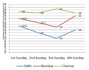 In the given line graph, what was the difference in temperature between Delhi and Mumbai on the 2nd Sunday?