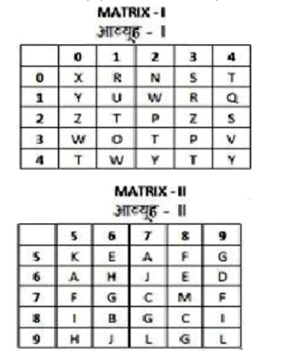 A word is represented by only one set of numbers as given in any one of the alternatives. The sets of numbers given in the alternatives are represented by two classes of alphabets as shown in the given two matrices. The columns and rows of Matrix-I are numbered from 0 to 4 and that of Matrix-II are numbered from 5 to 9. a letter from these matrices can be represented first by its row and next by its column, for example ‘Z’ can be represented by 20, 23 etc and ‘A’ can be represented by 65, 57 etc. Similarly, you have to identify the set for the word “TOWER”.