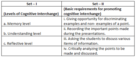 A college level assistant professor has planned his/her lectures with an intent to develop cognitive dimensions of students centered on skills of analysis and synthesis. Below, given are two sets of items Set – I consisting of levels of cognitive interchange and Set – II comprising basic requirements for promoting them. Match the two sets and indicate your answer by choosing the correct alternative from the code: