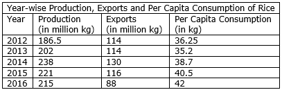 Direction: The table below embodies data on the production, exports and per capita consumption of rice in country P for the five years from 2012 to 2016. Answer questions 31 – 35 based on the data contained in the table.