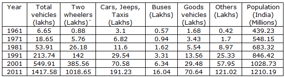 What was the average decadal growth in the number of cars during 1961 - 2011?