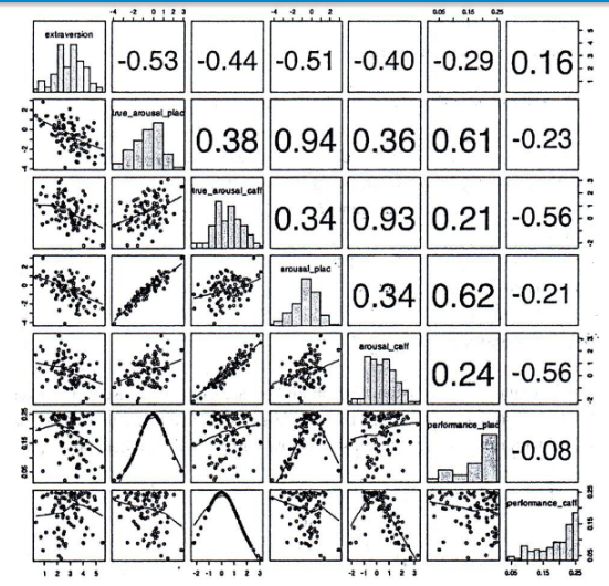 The grid below captures relationships among seven personality dimensions: "extraversion", "true_arousal_plac", "true_arousal_caff”, "arousal_plac", "arousal_caff”, "performance_plac", and "performance caff”. The diagonal represents histograms of the seven dimensions. Left of the diagonal represents scatterplots between the dimensions while the right of the diagonal represents quantitative relationships between the dimensions. The lines in the scatterplots are closest approximation of the points. The value of the relationships to the right of the diagonal can vary from -1 to +1, with -1 being the extreme linear negative relation and +1 extreme linear positive relation. (Axes of the graph are conventionally drawn).